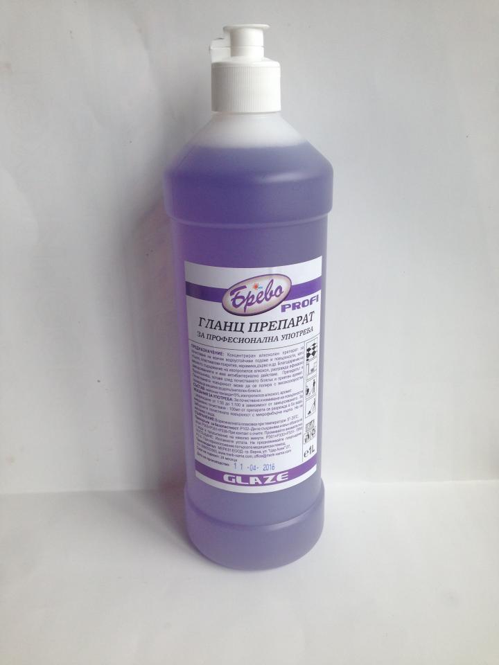 Предназначение: GLAZE - гланц препарат за професионална употреба. Концентриран алкохолен препарат за почистване на всички водоустойчиви подове и повърхности, като стъкло, пластмасови покрития, теракот, гранитогрес, мрамор, дърво и други. Благодарение на високото съдържание на изопропилов алкохол, разгражда ефикасно замърсяванията и има антибактериално действие. Препаратът е бързо съхнещ, оставя след почистването блясък и приятен аромат.